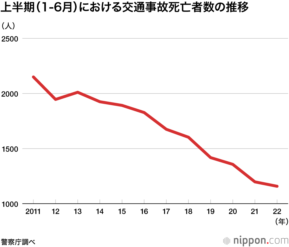 警察庁の発表によると、2022年上半期(1-6月)の全国の交通事故死者数は前年同期比40人減の1158人で、統計が残る1948年以降で最少となった。