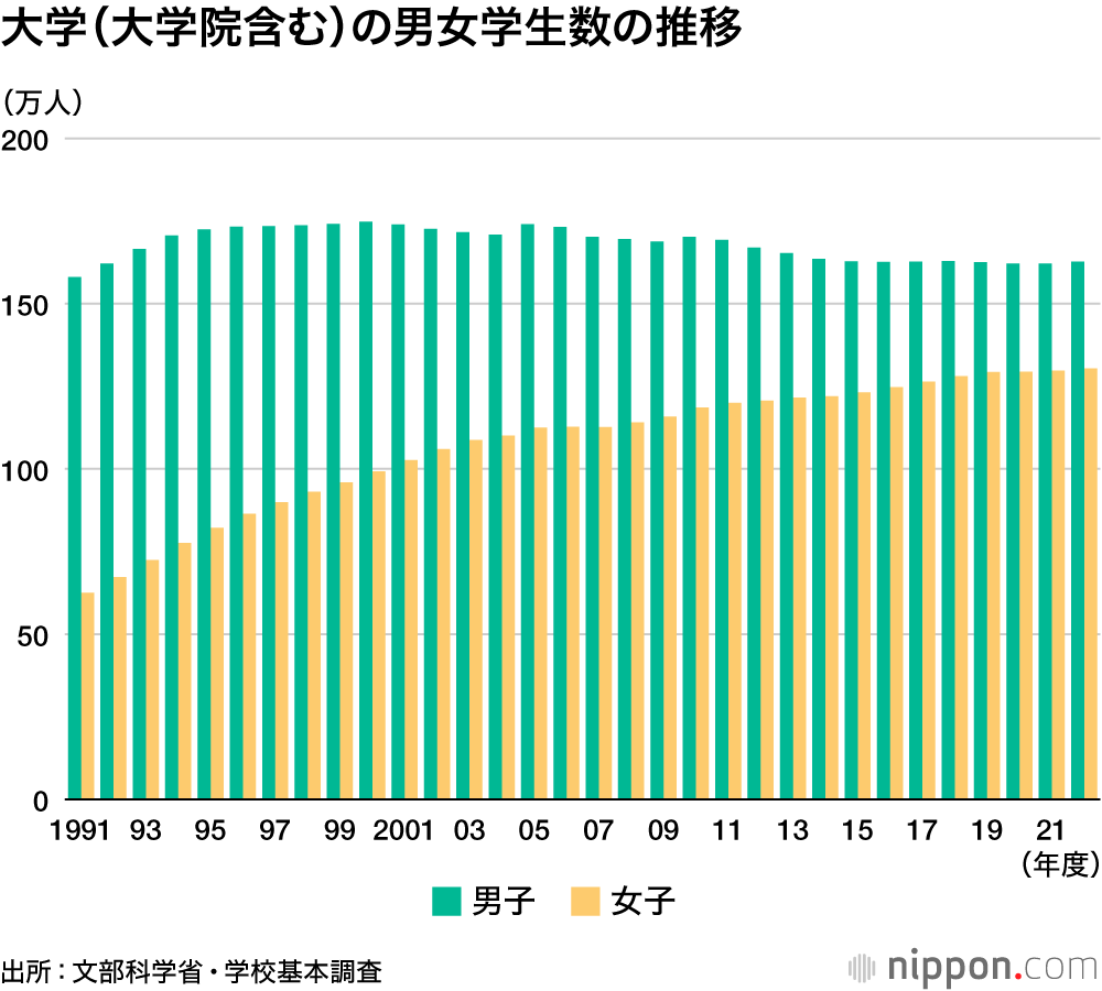 大学学部の学生数は263万2000人(前年度より6700人増)、うち女子学生は120万1000人(同4500人増)で、いずれも過去最多を更新した。学部学生に占める女子学生の割合は前年度と同じ45.6%で、過去最高を維持した。