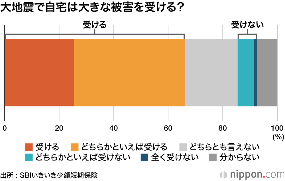「近い将来、居住地の近くで大地震が発生する」と思う人は60.9%、「地震で自宅に大きな被害を受ける」と考える人は66.2%に及ぶ。