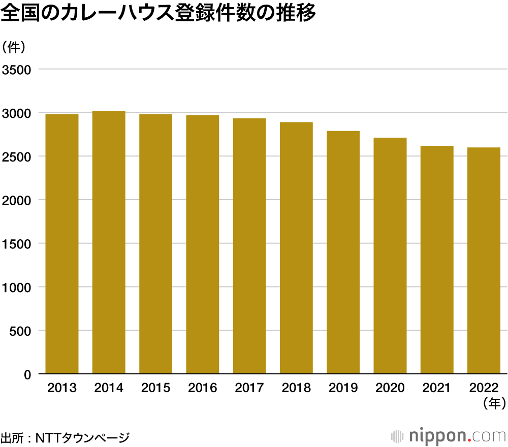 NTTタウンページ(本社・東京)が店舗の電話番号や業種を登録しているタウンページデータベースを活用して、2013~22年の全国のカレー店の登録件数の推移を調べたところ、2014年の3015件をピークに減少基調となり、2018年以降はそのペースに拍車がかかっている。競争の激化に加え、20年以降はコロナ禍で時短営業や休業を強いられたことなども影響しているとみられる。22年は2598件で、14年比400店舗以上の減少となっている。