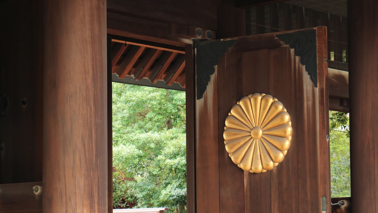 靖国神社の神門の菊の御紋章。直径が150センチと巨大(PIXTA)