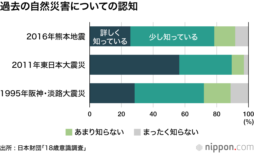 18歳の若者が7歳の頃、東日本大震災が発生した。日本財団の「18歳意識調査」では、過半数の人が東日本大震災の被害や影響について「詳しく知っている」と回答したが、今後、起こるかもしれない災害への備えは、必ずしも十分とは言えない状況だ。