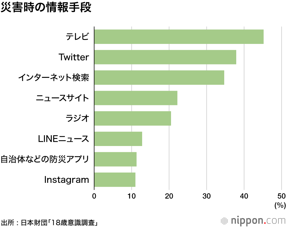 大規模災害発生時の情報手段としては、「テレビ」45.2%が最も多く、「Twitter」37.9%、「インターネット検索」34.7%が続いた。