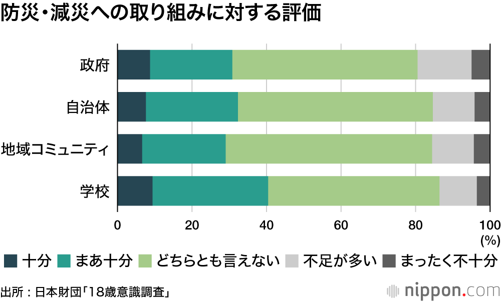 政府や自治体などの防災・減災への取り組みに対する評価は、「十分」「まあ十分」の合計が3~4割にとどまり、「不足」「不十分」と考える人の方が多かった。自由記述欄では「自治体が頼りにならないことが多い」「災害リスクを周知するだけで、具体的な対策がない」など厳しい意見も多かった。