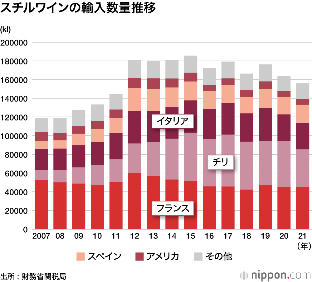 2021年の輸入スチルワイン(発砲しないタイプ)の構成比は、フランスワインが28.8%を占め、7年ぶりに首位に返り咲いた。前年まで6年連続でトップだったチリは25.9%。
