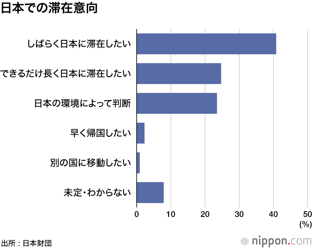 日本財団のウクライナ避難民へのアンケート調査で、約4分の1の人が「できるだけ長く日本に滞在したい」と定住の意向を持っていた。「ウクライナの状況が落ち着くまでは、しばらく日本に滞在したい」と合わせると65%超が長期滞在を希望している。