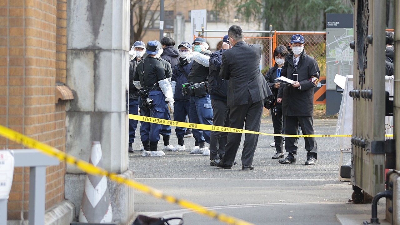 バナー写真:受験生刺傷事件で、現場付近を調べる捜査員=2022年1月15日、東京都文京区の東京大学(時事)