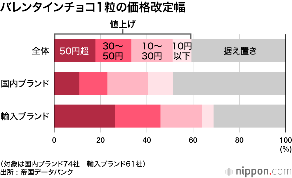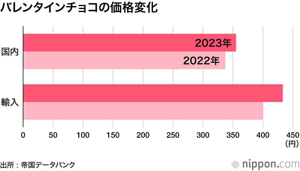 帝国データバンクが全国の百貨店やショッピングモールなどに出店するチョコレートブランドで前年度と比較可能な1粒当たりの価格を調査した結果、2023年は135ブランドのうち80ブランドで値上げが判明。平均価格は前年から約7%値上がりして1粒390円に上った。国内ブランドは前年から18円アップの355円、人気の高級ブランドが多い輸入品は33円アップの433円だった。