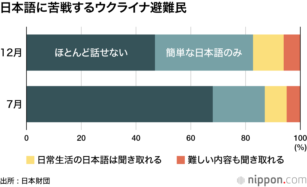 2022年7月と12月の調査を比べると「ほとんど話せない」人は68%から47%まで減少し、「簡単な日本語のみ聞き取れる」が増加した。若干の日本語能力の向上はうかがえるが、8割以上の人が日常会話にも不自由な状況が続いている。