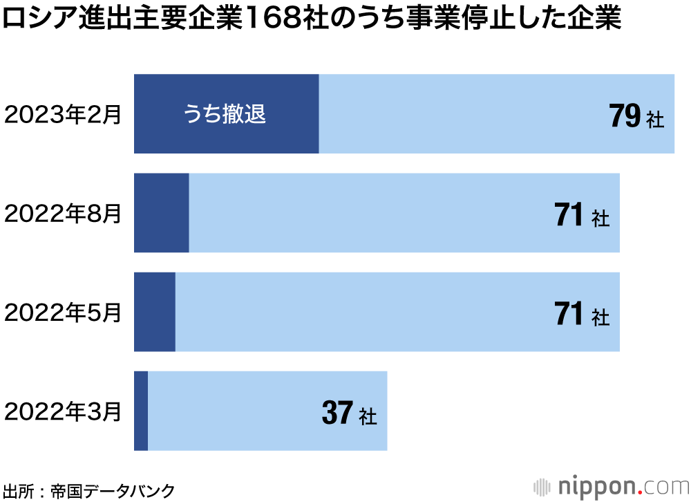 帝国データバンクの調査で、2022 年2月時点でロシアへの進出が判明していた国内上場企業168社のうち、半数近い79社が23年2月19日までにロシア事業を停止したり、制限・撤退を決めたことが明らかになった。