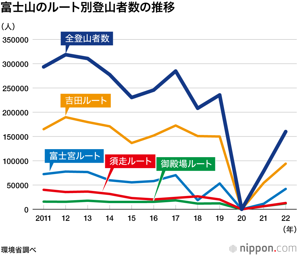 同省は05年から吉田、須走、御殿場、富士宮の4ルートの各8合目付近に赤外線カウンターを設置して、登山者数を調べている。22年で最も多かったのは吉田ルートの9万4000人。富士宮(4万2000人)、須走(1万3000人)、御殿場(1万2000人)の順となった。