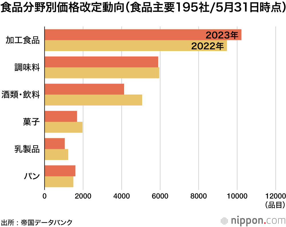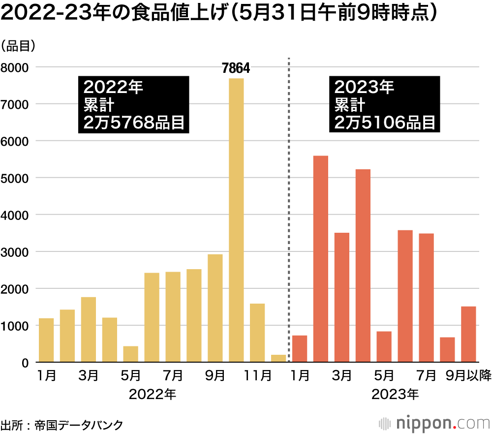 帝国データバンクの食品主要195社を対象とした調査で、2023年の家庭用を中心とした飲食料品の値上げ品目数が5月31日までの判明分で2万5106品目に達した。195社のうち9割超の企業で1回以上の値上げが実施された。