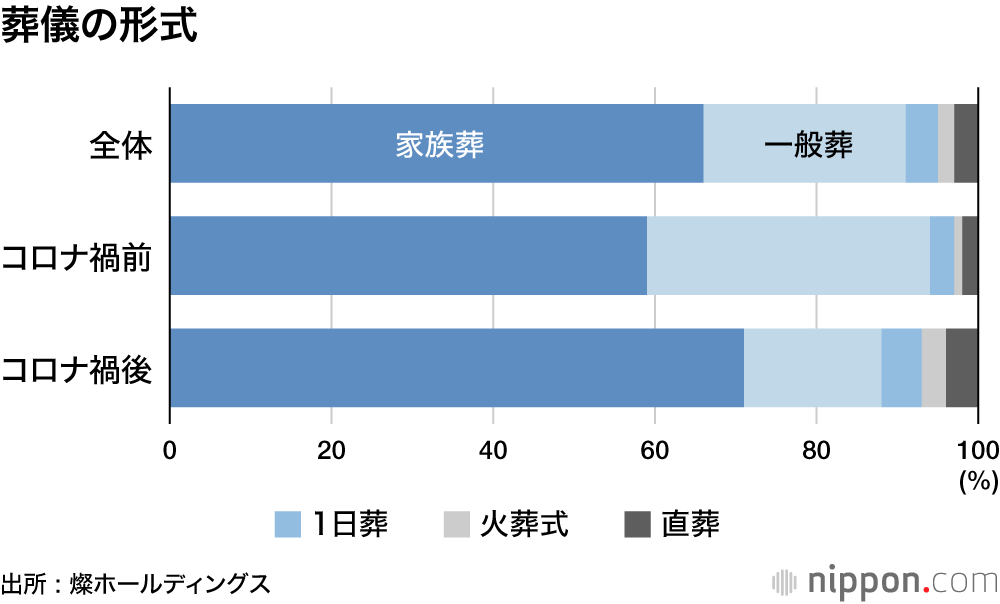 葬儀の形式は全体では家族葬(家族、親しい友人が参列)66%が最も多く、一般葬(家族・友人の他、仕事関係や近隣の人が参列)は25%だった。コロナ禍前後で比べると、参列者を減らし、密を避けるため、コロナ禍後は家族葬が71%だった。1日葬(通夜式を省いて葬儀のみ行う)、火葬式・直葬(簡単な見送りや、直接火葬)が増え、簡素化が進んでいる。