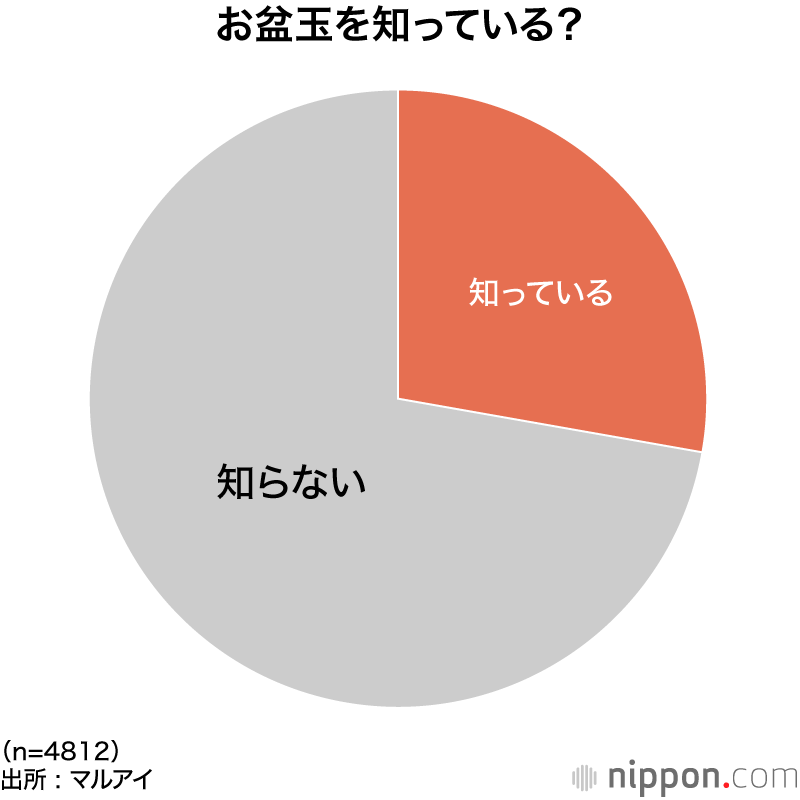 紙製品メーカーのマルアイ(山梨県市川美郷町)が20代以上の男女4812人を対象とした調査で、「お盆玉」を「知っている」人は27.8%だった。女性の認知度の方が高く、「知っている」人のうち53.7%が女性だった。