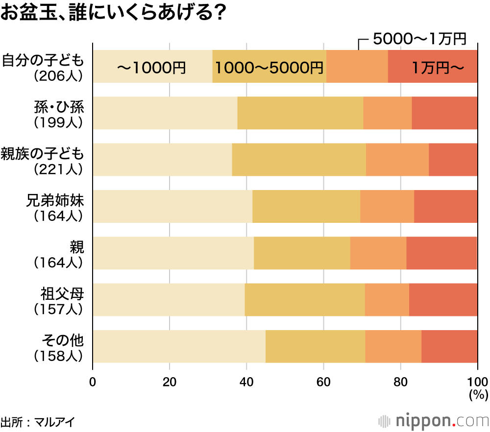 今年の夏に「お盆玉をあげる」予定の310人に「誰にいくらあげる予定か」聞いたところ、あげる相手は「親戚の子ども」221人、「自分の子ども」206人、「孫・ひ孫」199人と、子どもにあげる割合が高かった。