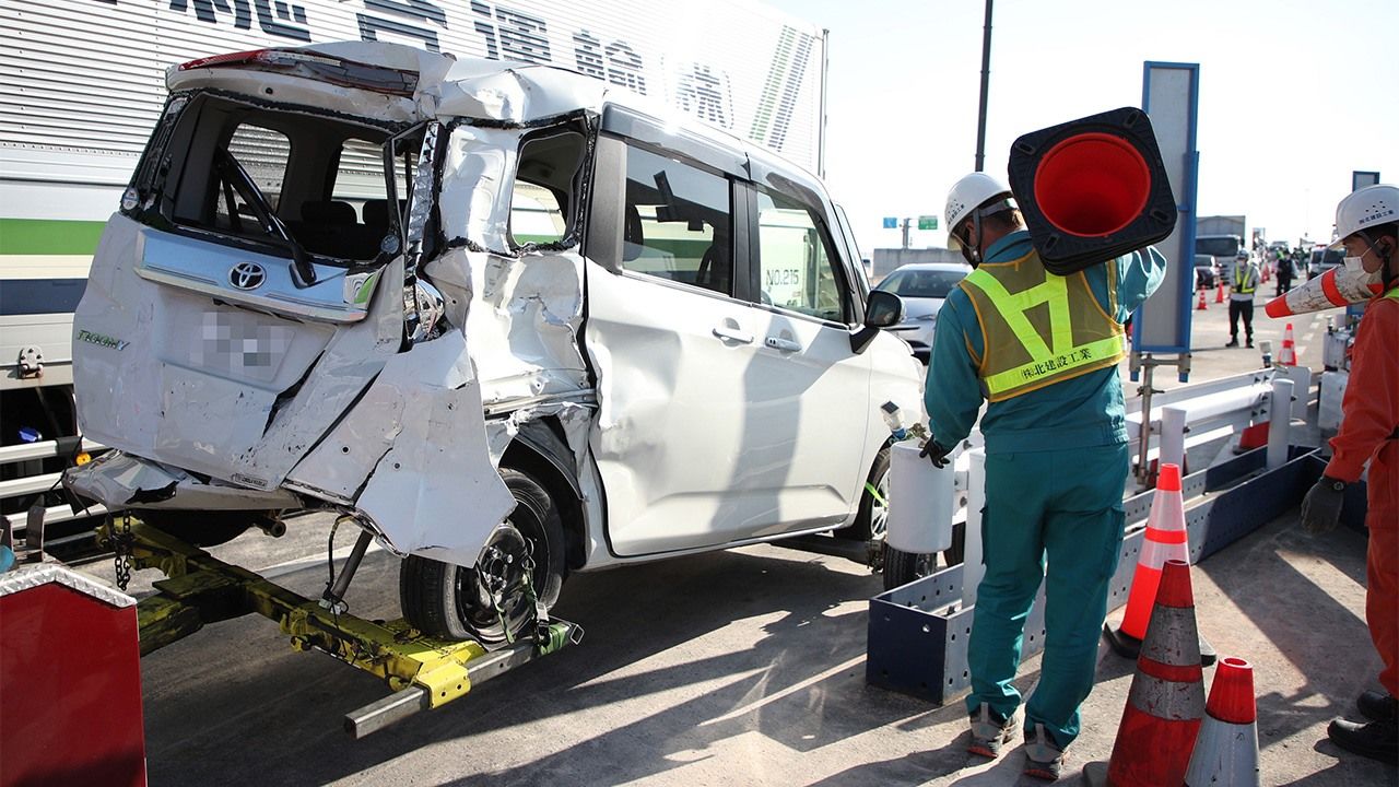 バナー写真:車約20台が絡む多重事故が起きた京奈和自動車道の橿原高田インターチェンジ(IC)出口付近から撤去される事故車両=2023年1月12日、奈良県橿原市(時事)