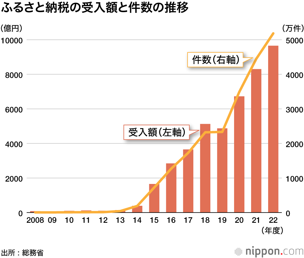 ふるさと納税、過去最高の9654億円―22年度 : 受入トップは宮崎県都城市195億円、流出は横浜市272億円