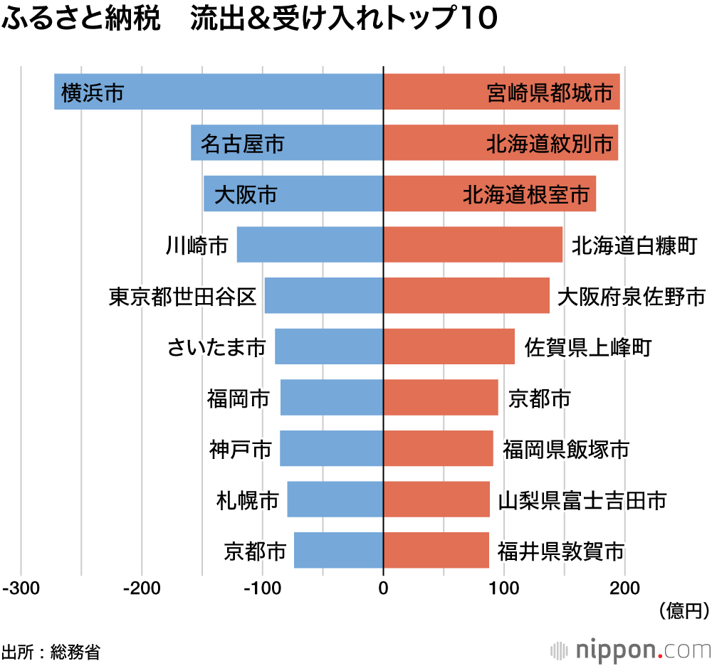 一方、ふるさと納税制度を利用した人が多い自治体ほど、住民税控除による税収「流出」の痛手を負うことになる。市区町村別で流出の断トツトップは「横浜市」の272億4200万円。以下、「名古屋市」159億2600万円、「大阪市」148億5300万円、「川崎市」121億1500万円、「東京都世田谷区」98億2300万円と政令市や東京都区部が並ぶ。人口が多く、企業も多い都市部は確かに税収は多いが、住民サービスのニーズも多く、ふるさと納税による財源流出に恨み節も出ている。