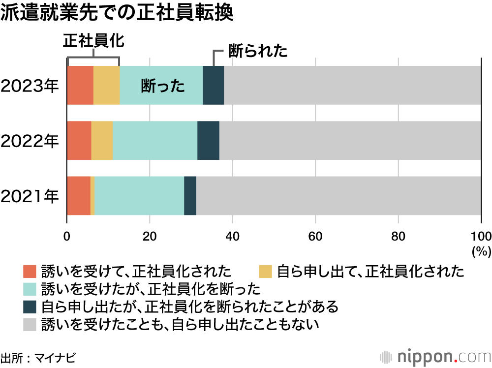 マイナビでは「企業の人材需要は増えている⼀⽅、経験者の採⽤は苦戦している。職場環境や実務内容をよく知っている派遣社員の正社員転換のハードルを下げていることが考えられる」と分析している。