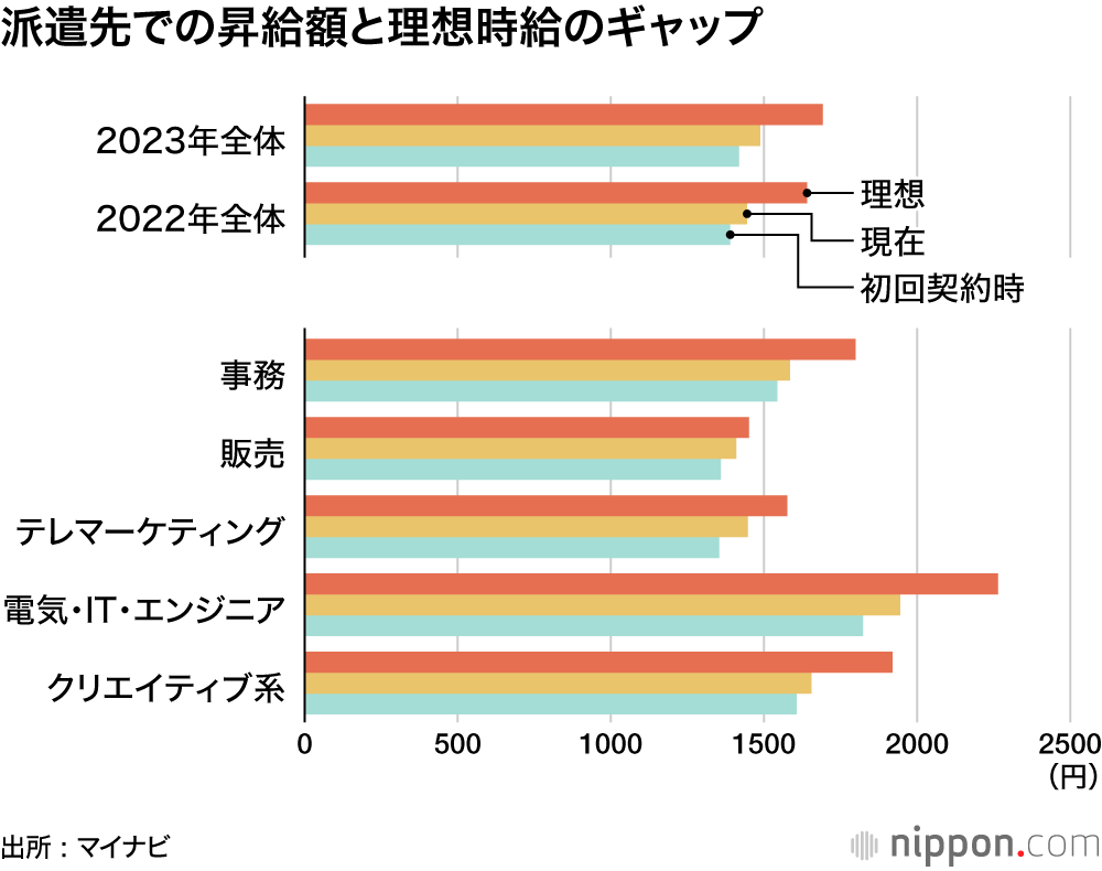 同⼀の派遣先における初回契約時からの昇給額を算出したところ、平均は69円となった。電気代やガス代など⽣活コストが上がるなか、昇給額の22年⽐は14円にとどまっている。