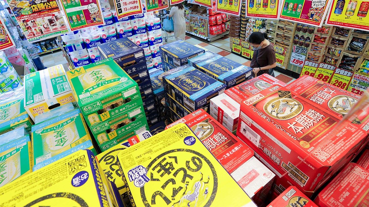 バナー写真 : 増税を前に、店内に積み上げられた第3のビールのケース=9月21日、東京都大田区のMEGAドン・キホーテ大森山王店(時事)
