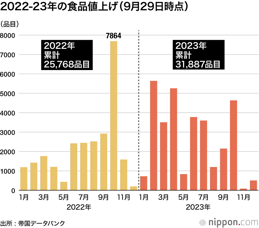 2023年通年の値上げ品目数は予定も含めて累計3万1887品目となる。バブル崩壊以降で類を見ない記録的な値上げラッシュとなったものの、10月の品目数は前年10月(7864品目)と比べて6割の水準にとどまり、3カ月連続で前年同月を下回った。前年の急激な原材料高については、小売り価格への転嫁が一巡したことから、帝国データバンクでは、「値上げは10月をいったんのピークとして年末にかけて小康状態が続く」とみている。
