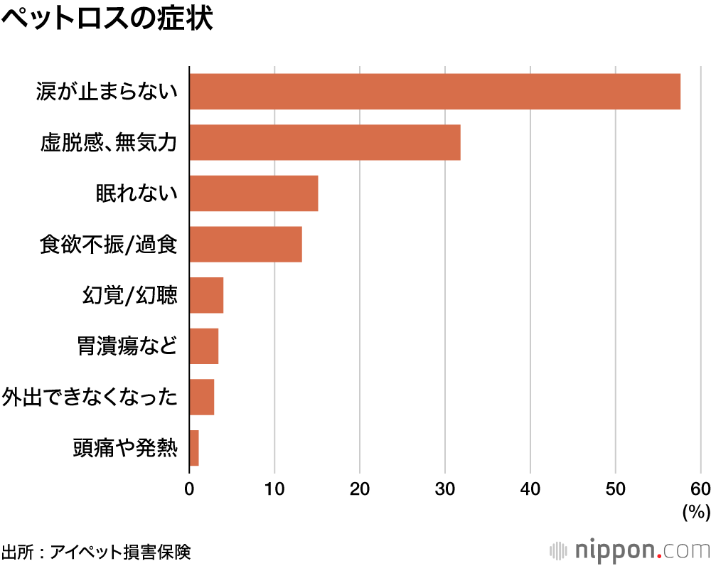 「ペットロス」の症状としては、「突然悲しくなり涙がとまらなくなった」60.3%が最多で、「虚脱感、無気力」31.8%、「眠れない」15.1%、「食欲不振/過食」13.2%などの多様な症状に見舞われていた。
