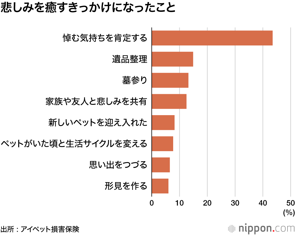 悲しみを癒すきっかけとなったこととして、43.5%の人が「ペットを悼む気持ちを肯定する」を選択。現実と向き合い、悲しみを肯定することで乗り越えようとする人が多いようだ。続く「遺品整理」14.9%、「墓参り」13.2%も同じようにペットを失ったことを受け入れるための行動と言える。