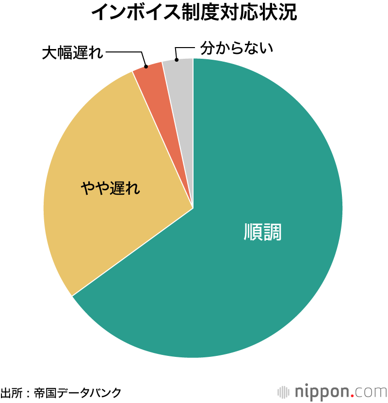 帝国データバンクが制度スタートから間もない10月6-11日に企業の対応状況などについてアンケート調査(有効回答数1494社)したところ、65.1%が「順調に対応」と回答。「やや遅れ」28.5%、「大幅遅れ」は3.1%だった。