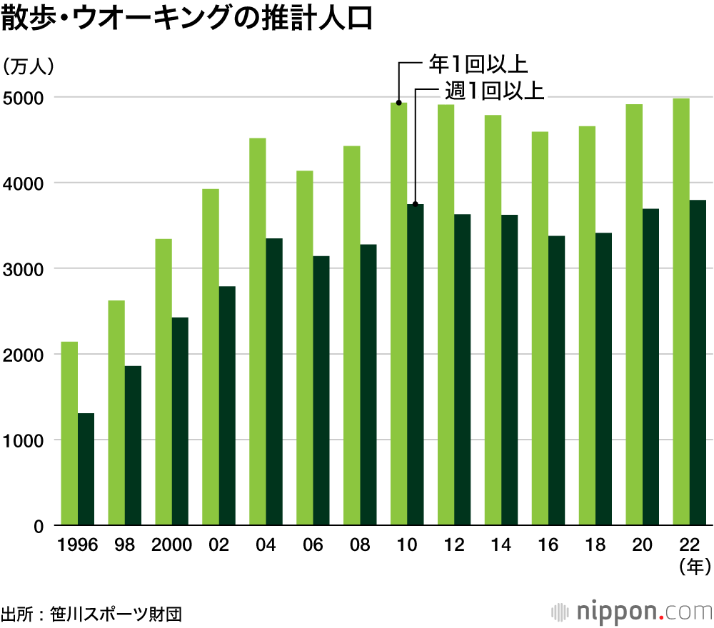 笹川スポーツ財団が隔年で継続的に実施している「スポーツライフに関する調査」で、2022年の年1回以上散歩・ウオーキング実施率は48.3%で、推計実施人口は4981万人だった。ほんの気まぐれや健康診断の直前だけでなく、週1回以上の定期的に実施している率は36.8%、推計人口は3795万人。1996年には実施率13.6%、推計人口1306万人だったが、この26年間で実施率と推計人口が3倍近く増加した。