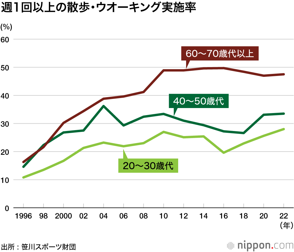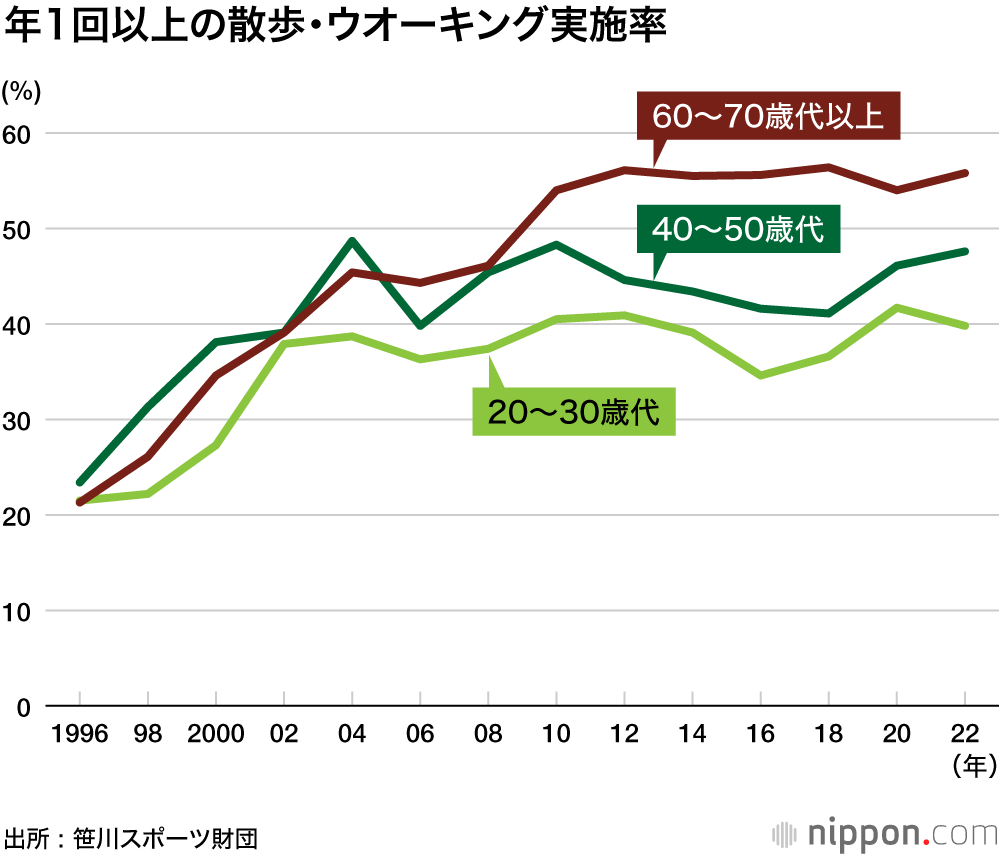笹川スポーツ財団では、「写真・動画の撮影やSNSへの投稿、位置情報ゲームや歩数の記録など、スマホアプリを活用した楽しみ方が、若い世代の実施率増加につながったと推察される。60歳以上の実施率が過去10年間横ばいで推移している中、近年の散歩・ウオーキング実施率の増加を牽引している若い世代の動向が今後も注目される」と分析している。