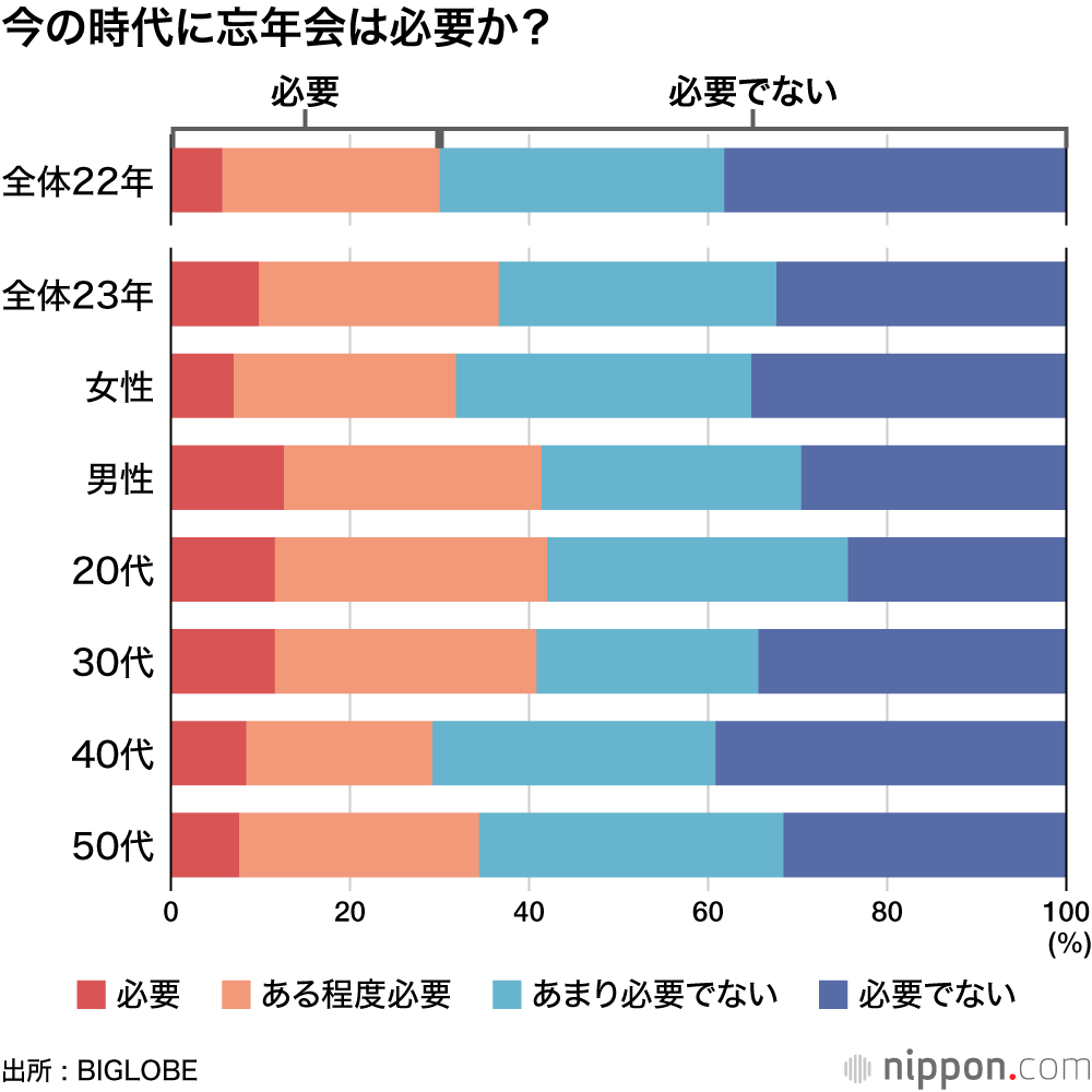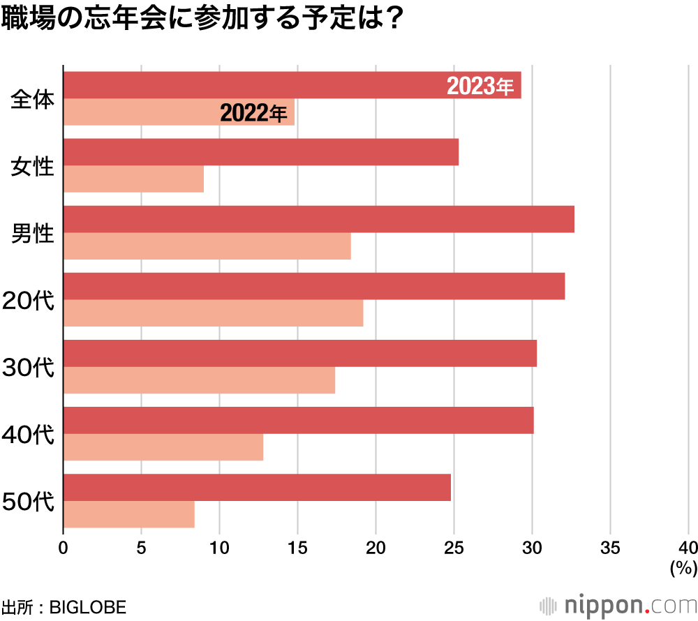 コロナ禍が収束して、久々に気兼ねなく家族や友人と年末年始を過ごす予定の人も多いのではないだろうか。BIGLOBE(本社東京都品川区)が11月中旬、全国の20-50代1000人に対象に今年の忘年会についてアンケート調査を実施した。