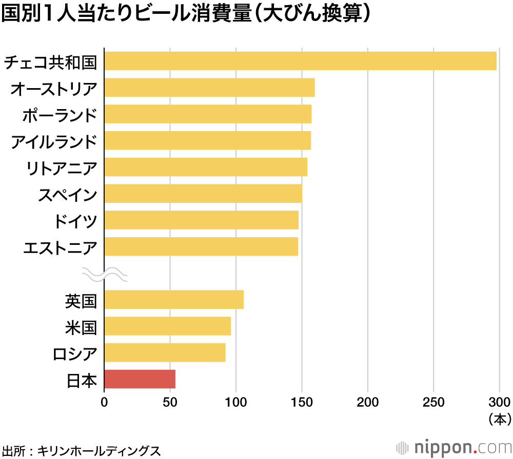 国別の1人当たりビール消費量は、チェコ共和国が188.5リットル(大びん換算 297.7本)で1993年から30年連続で1位。日本は34.2リットル、大びん換算では前年より1.5本増の約54.0本となったが、チェコと比べると5分の1以下だった。