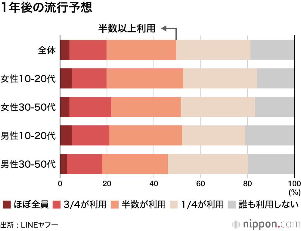 「1年後、自分のまわりでどのくらいの人が利用していると思うか」という近未来の流行予測については、「ほとんど全員」が4%、以下「4人中3人」16%、「4人中2人」30%、「4人中1人」32%、「ほぼ誰も利用していない」19%だった。女性男性ともに、「半数以上利用している」とイメージする人が5割前後となっており、1年後には、使っていないと乗り遅れた気分になるかも…。
