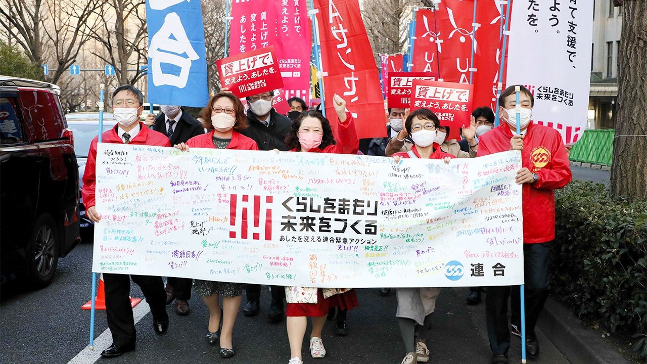 バナー写真:2023年春闘の決起集会を控え、デモ行進する連合の芳野友子会長(手前中央)ら=2023年3月7日、東京都千代田区(時事)