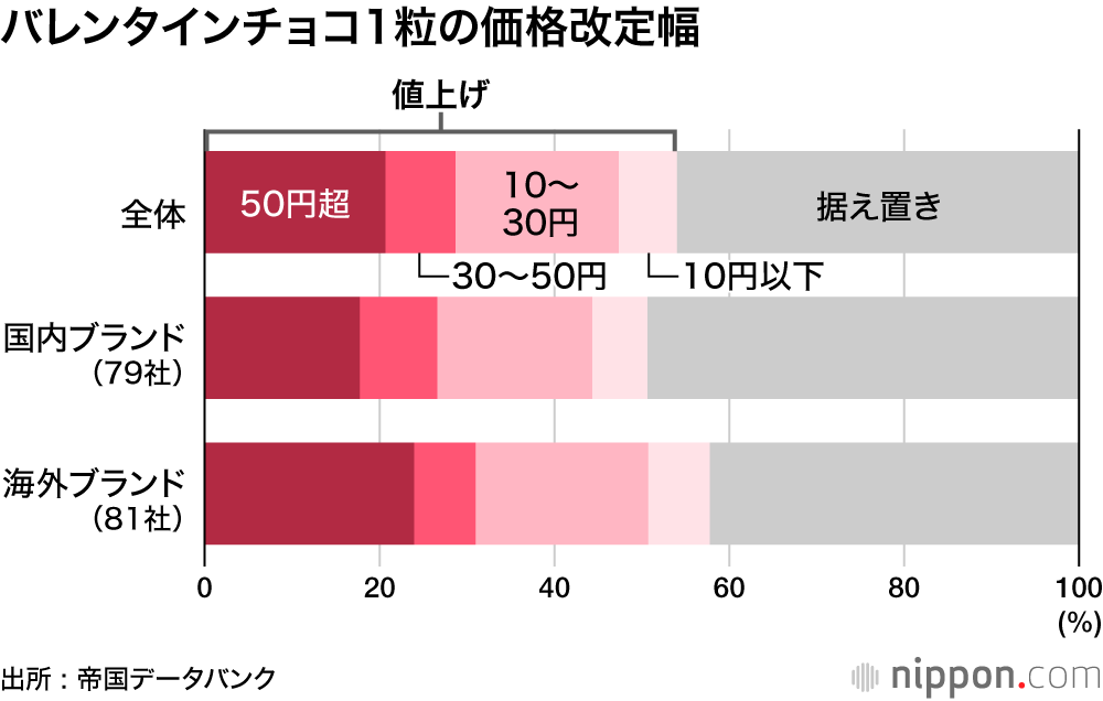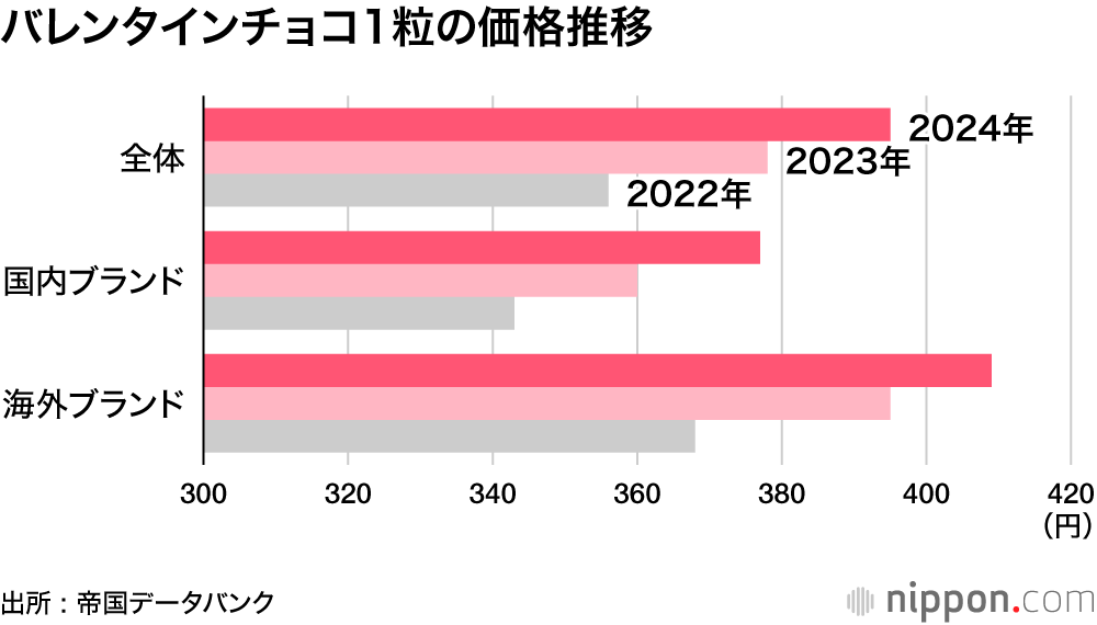 帝国データバンクが全国の大手百貨店やショッピングモールなどが販売する計150ブランドのバレンタイン向けチョコレート(1粒バラ売りまたはアソートタイプ等)を調査したところ、1粒当たりの平均価格は前年より17円アップの395円だった。このうち、国内ブランドは前年から17円アップの377円、フランスやベルギーなどの人気のインポートブランドは14円アップの409円だった。