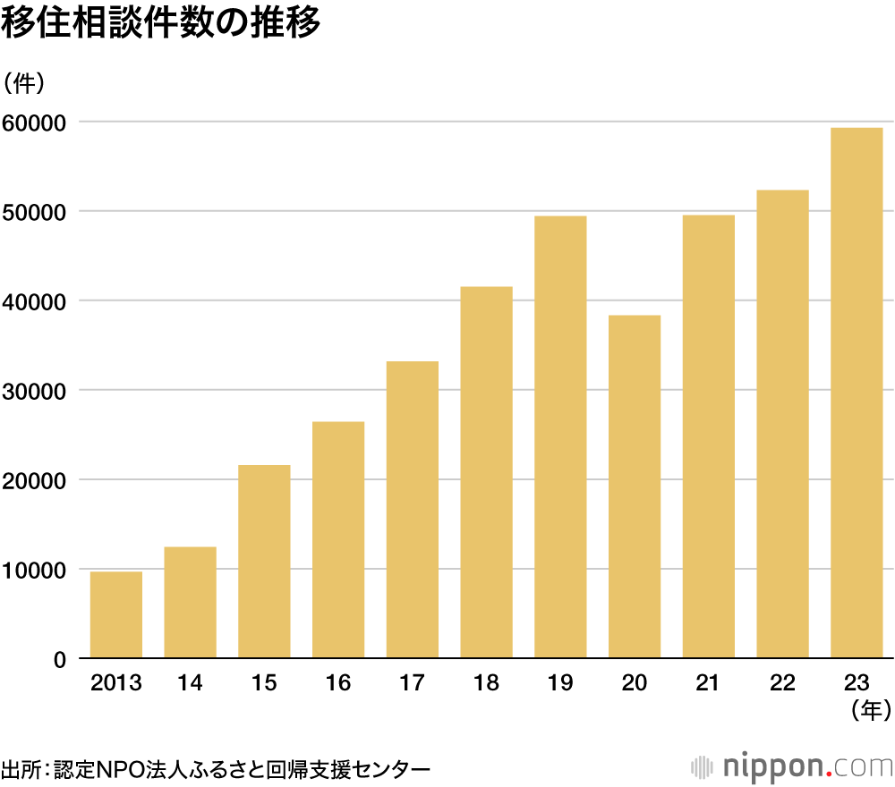 23年の移住相談件数(面談、電話、メール、見学、セミナー参加)は、過去最多の5万9276件で、22年に比べ13.3%増えた。過去最多の更新は3年連続。相談者の43.6%は都内在住者という。