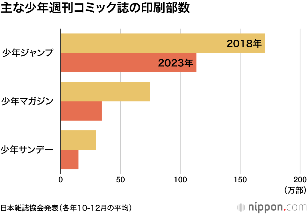 1995年新年号で公称発行部数653万部を記録した集英社のコミック誌『週刊少年ジャンプ』は、現在113万部(日本雑誌協会が発表した2023年10-12月の平均印刷部数)余りとなっている。もちろん同社は、マンガ雑誌アプリ「少年ジャンプ+(プラス)」で作品を配信し、電子コミックに対応している。