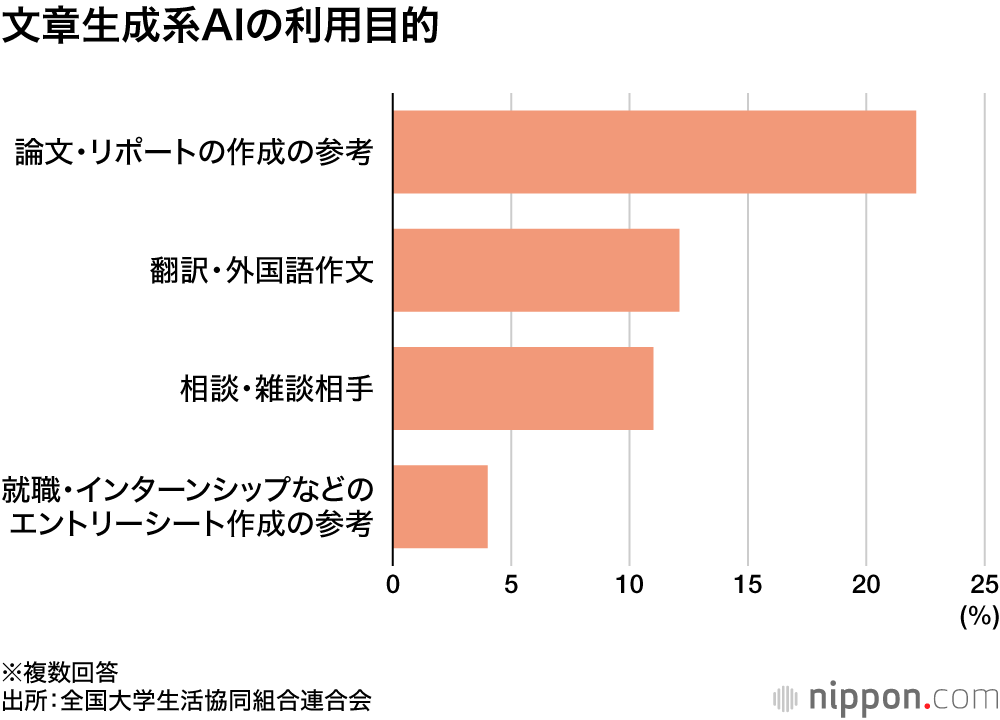 生成AI利用の目的を尋ねると(複数回答)、「論文・リポートの作成の参考」(22.1%)、「翻訳・外国語作文」(12.1%)、「相談・雑談相手」(11%)が上位だった。