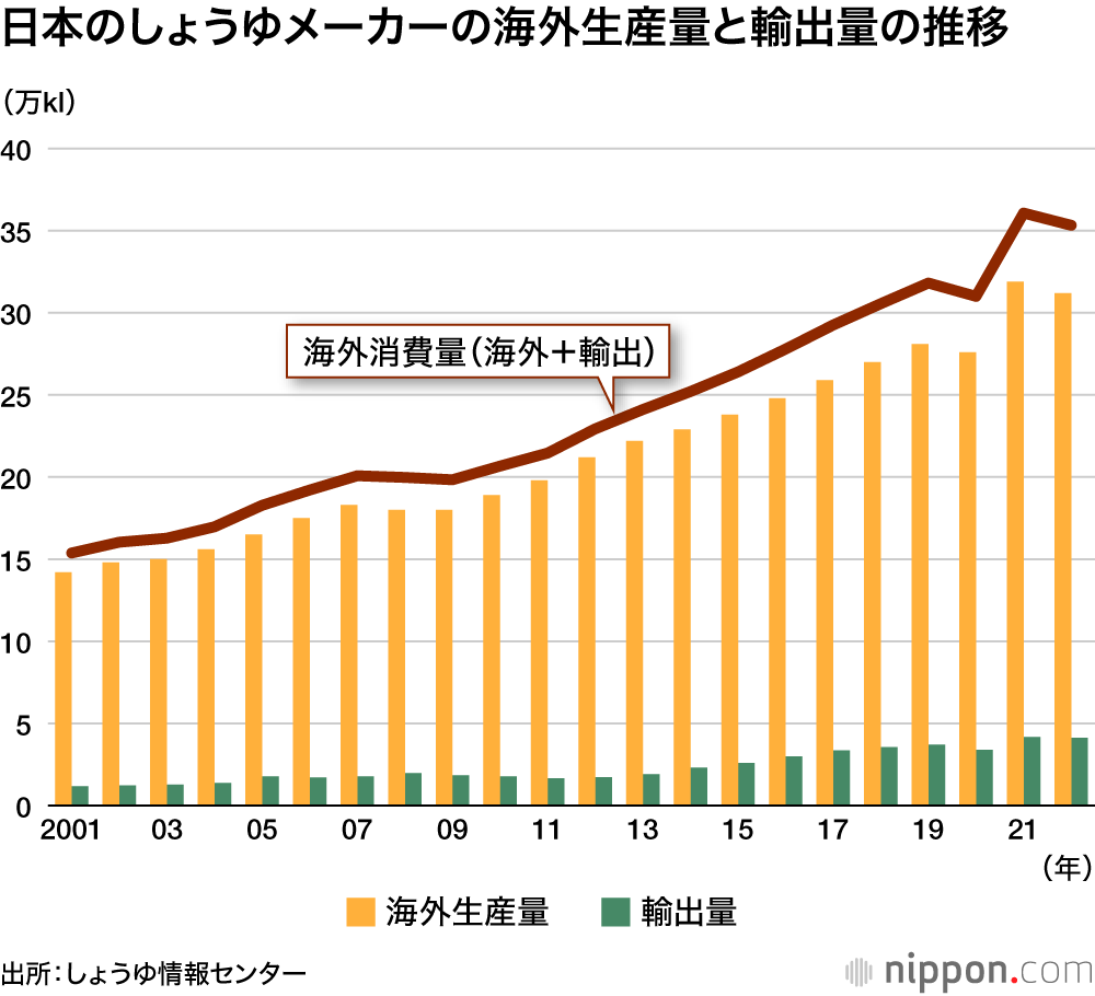 日本醤油協会などが設立した情報発信機関「しょうゆ情報センター」(東京)によると日本のしょうゆメーカーの海外工場産量は2022年実績で31万2000キロリットル。輸出量は約4万1000キロリットルで、この2つを合わせた「海外消費量」は35万3000キロリットル。これは、一般的な大型原油タンカー(VLCC)の積載量の1.1倍にあたる。