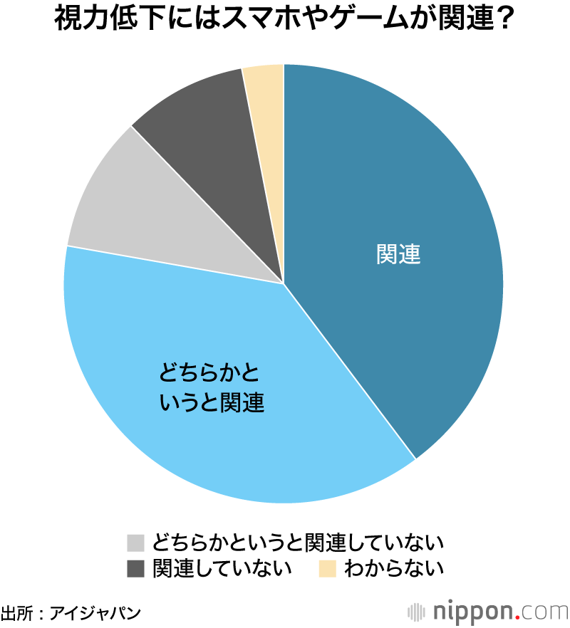 子どもの視力低下にスマホや携帯型ゲーム機が関連していると思うか質問したところ、「関連している」は40.0%、「どちらかというと関連している」は37.9%にのぼり、合計で77.9%だった。