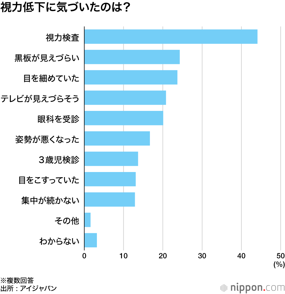 子どもの視力低下に気付いたきっかけを聞いた質問で、最も多かったのは「視力検査」44.1%で、「黒板の文字が見えづらいと言うようになった」24.3%、「目を細める時が増えた」23.7%と続いた。