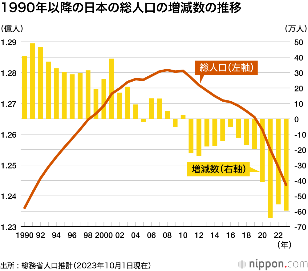 総務省が公表した人口推計によると、2023年10月1日時点の総人口は前年比59万5000人(0.48%)減の1億2435万2000だった。総人口の減少は13年連続。このうち日本人の人口は1億2119万3000人で83万7000人(0.69%)減り、1950年以降で最大の落ち込み。
