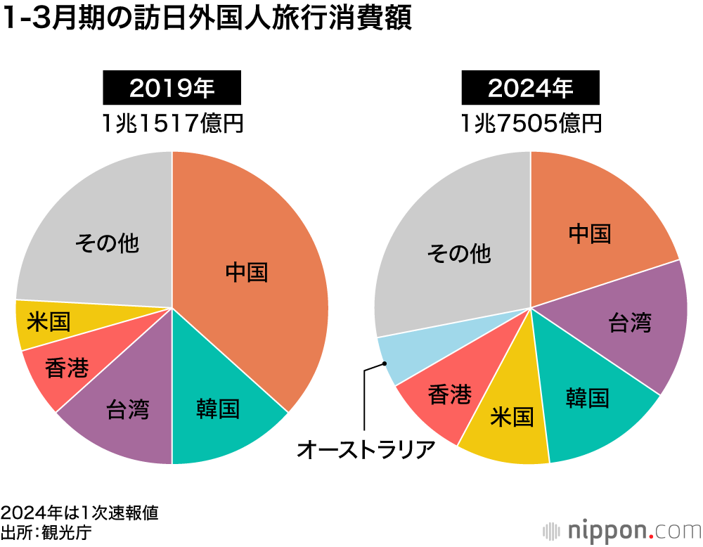 観光庁がこのほど発表した訪日外国人消費動向調査(1次速報)によると、2024年1-3月期の旅行消費額(推計)は、前年同期比73.3%増の1兆7505億円となった。この額は、新型コロナウイルス感染拡大前の2019年同期と比べても、52.0%も増加した。