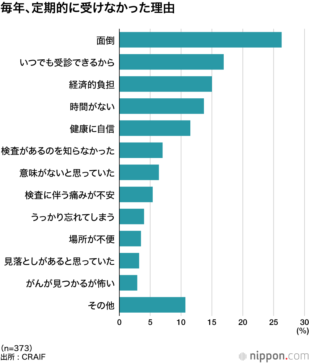 がん検診を定期的に受けていなかった人にその理由を聞いたところ、トップは「面倒」26.3%。以下、「いつでも受診できる」16.9%、「経済的に負担」15.0%が続いた。