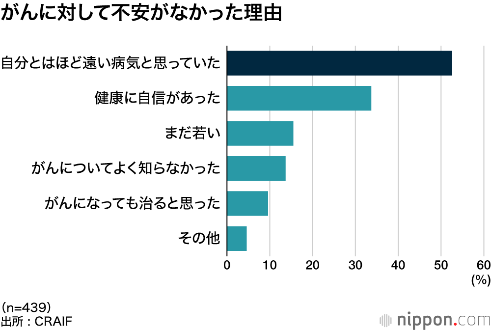 がん経験者の6割以上は、がんに対する不安を感じていなかったと回答。その理由としては、「自分とはほど遠い病気だと思っていた」52.6%が最も多く、「健康に自信があった」33.7%、「まだ若いから」15.5%と続いた。2人に1人ががんにかかる時代だが、2人に1人以上が不都合な真実からは目をそらしていた。