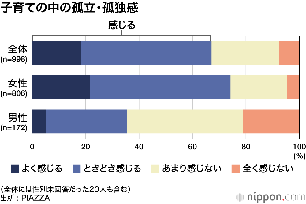 地域コミュニティアプリを運営するPIAZZA(東京都中央区)が、同社ユーザーで子育て経験のある人を対象に「子育て中の孤立・孤独」についてウェブ調査を実施、998人から回答を得た。回答者の内訳は、女性806人、男性172人、性別未回答20人で、このことからも育児の負担が圧倒的に女性に偏っていることがうかがえる。