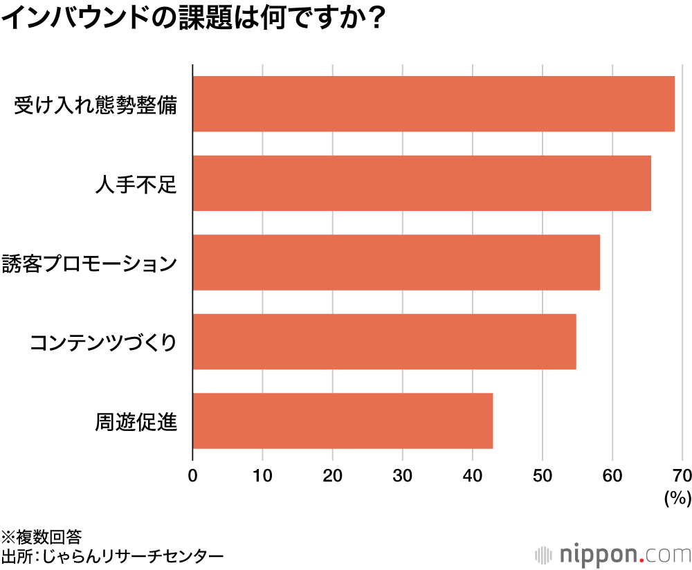 インバウンドに関する課題として挙げられたのは、多言語対応や混雑緩和策などの「受け入れ態勢整備」が最も多く68.9%。「人手不足」(65.5%)、「誘客プロモーション」(58.2%)が続いた。世界文化遺産の富士山や古都・京都などで問題化している過剰な混雑、相次ぐマナー違反などに代表される「オーバーツーリズム(観光公害)」は11.9%だった。JRCの松本百加里研究員は「コロナ禍からの急激な訪日客の回復に、観光地が追い付いていない現状が浮かび上がっている」と指摘している。
