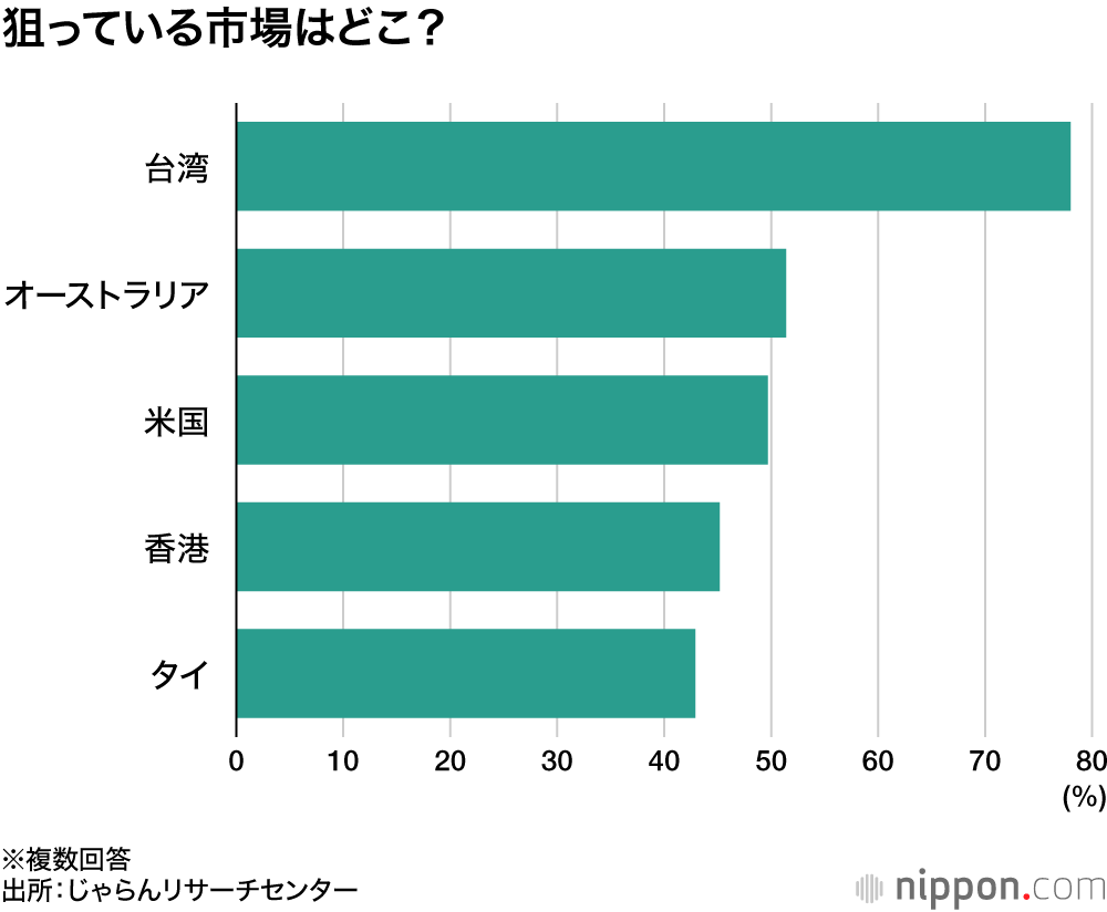 観光地がインバウンド市場のターゲットとしている国、地域は、台湾が最多で78%だった。次いでオーストラリア(51.4%)、米国(49.7%)となった。2023年の調査と比較すると、豪州が順位を上げて米国と入れ替わった。台湾の人々は繰り返し訪日する傾向が強く、大都市以外の地方への周遊が期待できることから、選ばれたとみられる。豪州、米国からの訪日客は、旅行期間が長いことや円安効果もあって、消費金額が大きくなることが観光地にとって魅力になっているようだ。