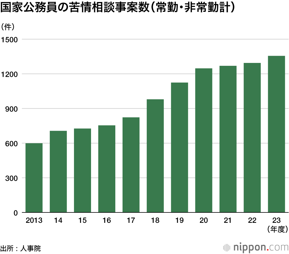 2023年度に各府省の一般職の国家公務員から人事院に寄せられた苦情相談が1355件で、6年連続で過去最多を更新した。同一人物から複数回同じ内容の相談を受けた場合は1件として計上した。